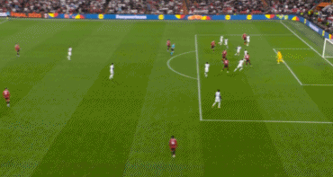 萨尔左路传中,禁区乱战中,布伦南-约翰逊在卢克肖的防守下,勉强完成射门,奥纳纳扑救不及,皮球钻入死角,热刺1-0领先!